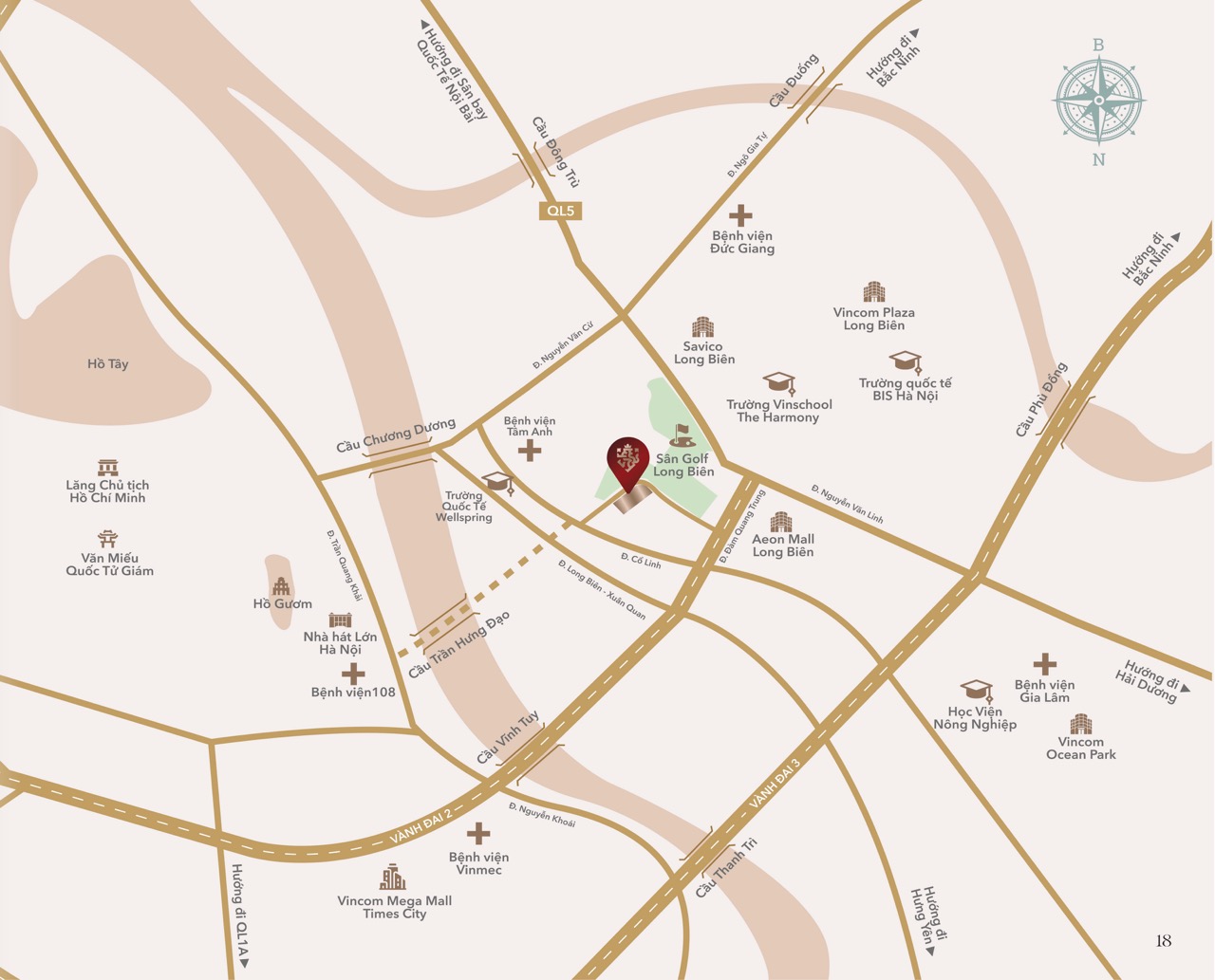 Tọa lạc tại Quận Long Biên – cửa ngõ kết nối khu Đông với trung tâm, dự án di chuyển thuận lợi về Hoàn Kiếm và ra sân bay Nội Bài nhờ mạng lưới cầu – vành đai – cao tốc đã hình thành. Tọa độ sát sân golf nội đô tạo lợi thế khác biệt khó thay thế.